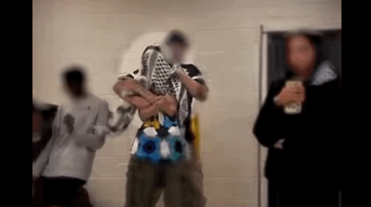 The following month, students from nearby Thomas Jefferson High School in Alexandria, Virginia posted a similar but even more disturbing performance. Shot inside a classroom in their high school, the video depicts a young woman with a black hijab and a Palestinian keffiyeh around her neck. The keffiyeh is a symbol widely associated with anti-Israel terrorism and the pro-Palestinian cause.