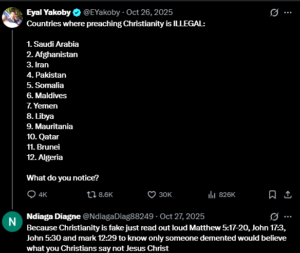 Under Islamic law, ‘polytheists’ are pagans who can be killed at will. In multiple tweets, an account with the same name ridiculed Christianity and defended Muslim countries banning Christianity.
