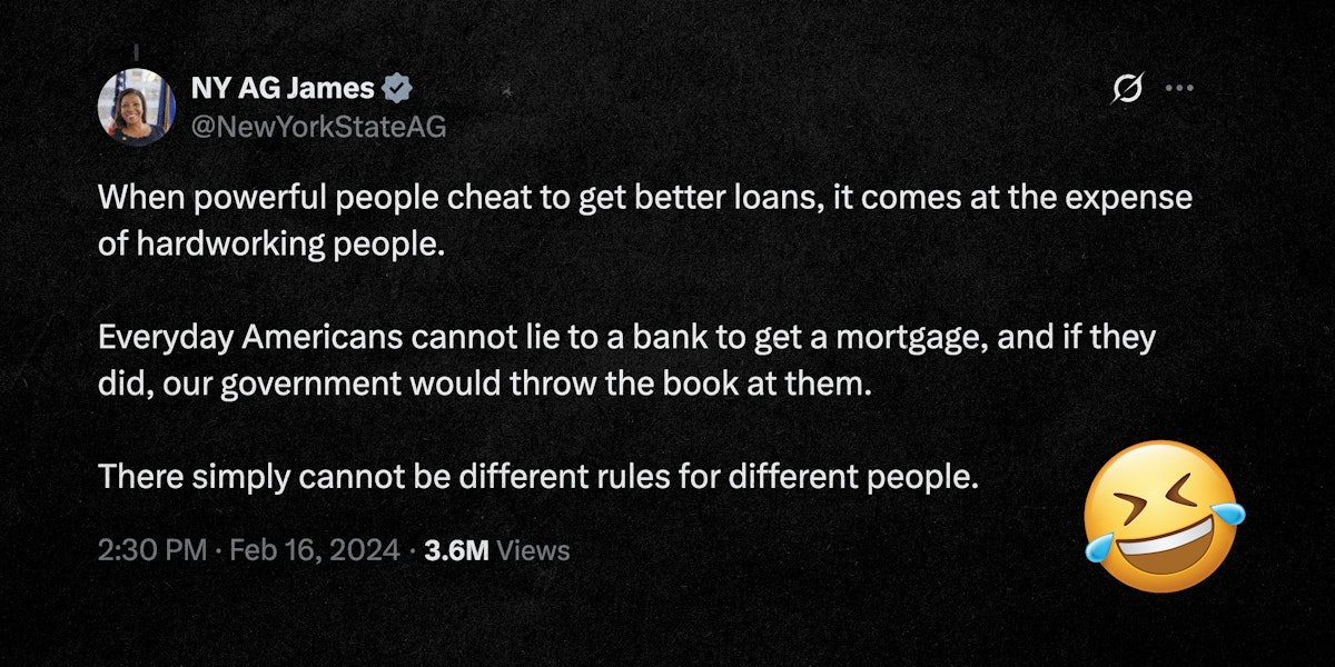 If she is the chief law enforcement officer of New York, yes. Especially after she once lectured on social media, “When powerful people cheat to get better loans, it comes at the expense of hardworking people.” Especially after she was elected on a promise to get Trump and then prosecuted him for virtually the same supposed crime.