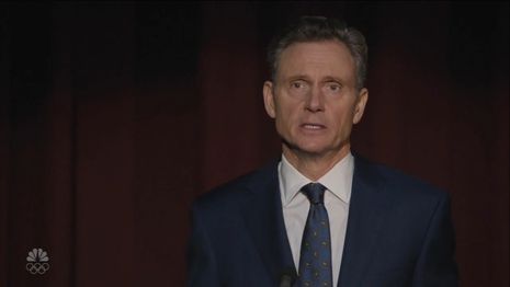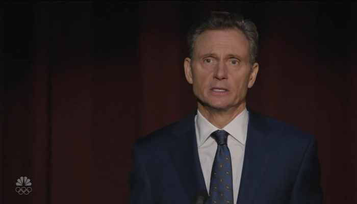 The scene then switches to a dinner speech being given by District Attorney Nicholas Baxter (Tony Goldwyn)