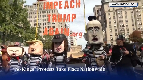 DUNCAN: Today, organizers say at least seven million Americans took to the streets protesting what many called an abuse of power by President Trump. House Speaker Mike Johnson called it, quote, the “hate America rally.” Here in New York City, police say 100,000 people turned out at multiple marches. They report no arrests. There were more than 2,600 events from coast coast. They are all part of the “No Kings” movement, which accuses the president of behaving more like a monarch than an elected official.