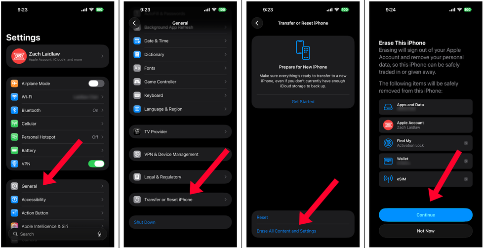 For iPhone owners, select “General,” swipe down, and tap “Transfer or Reset iPhone.” Hit “Erase All Content and Settings,” then “Continue.” From here, Apple may prompt you for your lockscreen passcode and your iCloud password. Type these in to erase your old device. The old phone will cycle through a reboot, and once you see the “Hello” screen, you’re all done.