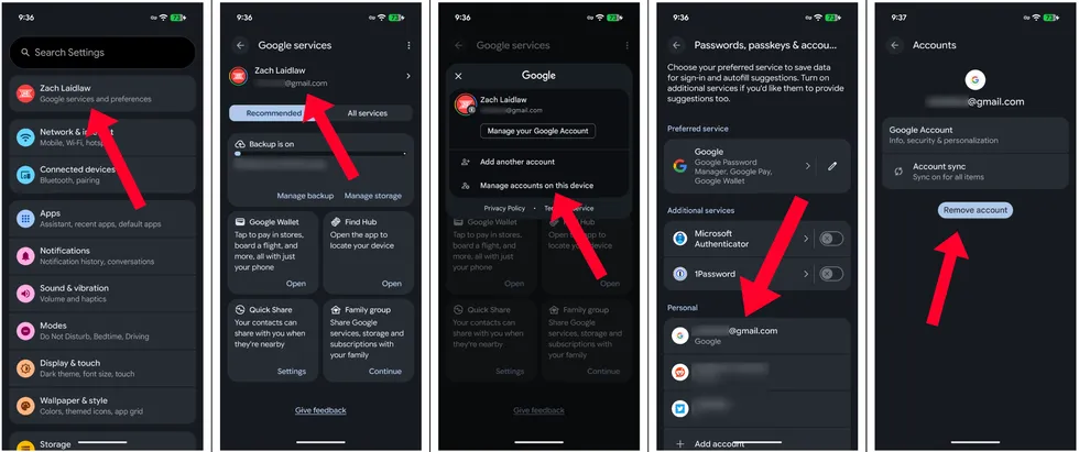 For Android owners, tap on your Google account at the top of the page, select your account email address, then “manage accounts on this device.” Under the “Personal” section, select your email address one more time and remove the account from your old phone. It’s important that you remove your Google account first; otherwise your old device will show up in your account for another month or two.