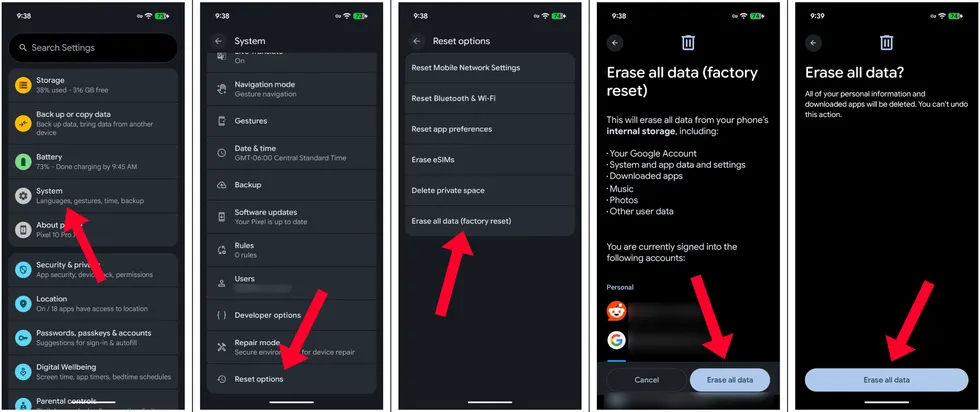 Once that is done, go back to the main Settings app page and choose “System.” Scroll all the way down, select “Reset options,” tap on “Erase all data (factory reset),” then “Erase all data” again. You’ll need to enter your lockscreen PIN, confirm one more time that you want to erase all data, and you’re done.