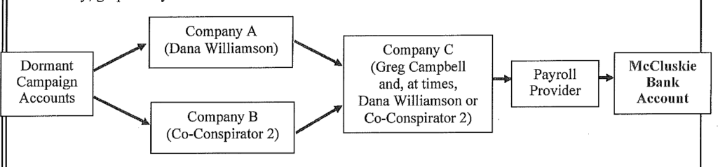 The indictment includes a flowchart defining the movement of money, and it alleges that McCluskie and others lied to Becerra, telling him “$10,000 a month was a reasonable amount to pay for monitoring dormant campaign accounts.”