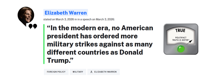 Ohio University student Zoe Weyand does appear to be correct on this: Trump has ordered strikes on ten different countries. They suggested the “modern era” started with George W. Bush. But why are we only locating the True statements? Like Schumer, Warren hasn’t been rated on the False side for a long time — since 2020. Since then, including the new one, Warren has two “Half Trues” and three “Trues.”