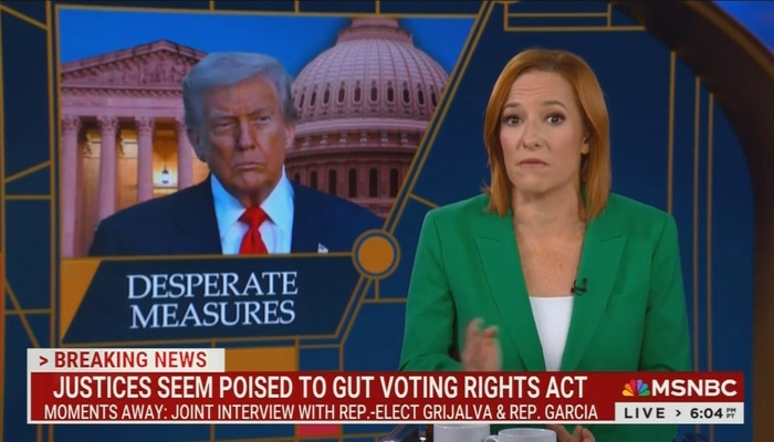 MSNBC’s Jen Psaki delivered a factually challenged monologue on Wednesday’s The Briefing. As Psaki tells it, if the Supreme Court rules that race-based gerrymandering in the form of majority-black districts is unconstitutional, it will be helping Republicans “rig” elections by allowing them to racially gerrymander themselves 19 additional House seats. Of course, that makes zero sense, but this is MSNBC.