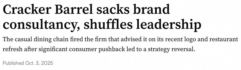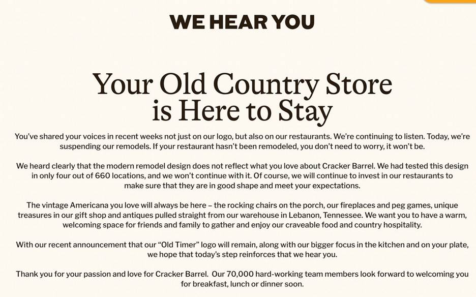 If you believed that the Cracker Barrel rebranding was poorly done and would alienate the company’s customers, you were falling for an invented reality that was completely meaningless and frivolous. Then Cracker Barrel fired a bunch of managers and its rebranding consultant, abandoned the rebranding, and apologized profusely, while its stock plummeted.