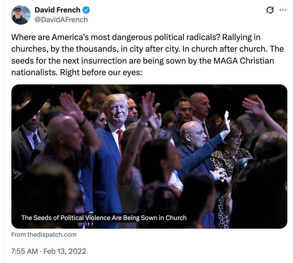 David French, 2022: Churches are terrorist training centers, and churchgoing Americans are preparing to attack the country in a vast wave of right-wing insurrectionist violence. When you drive past one of the Lutheran terror cells, you’re looking at the next 9/11, because here comes the Christian nationalist insurrection that they’re prepping for in the pews.