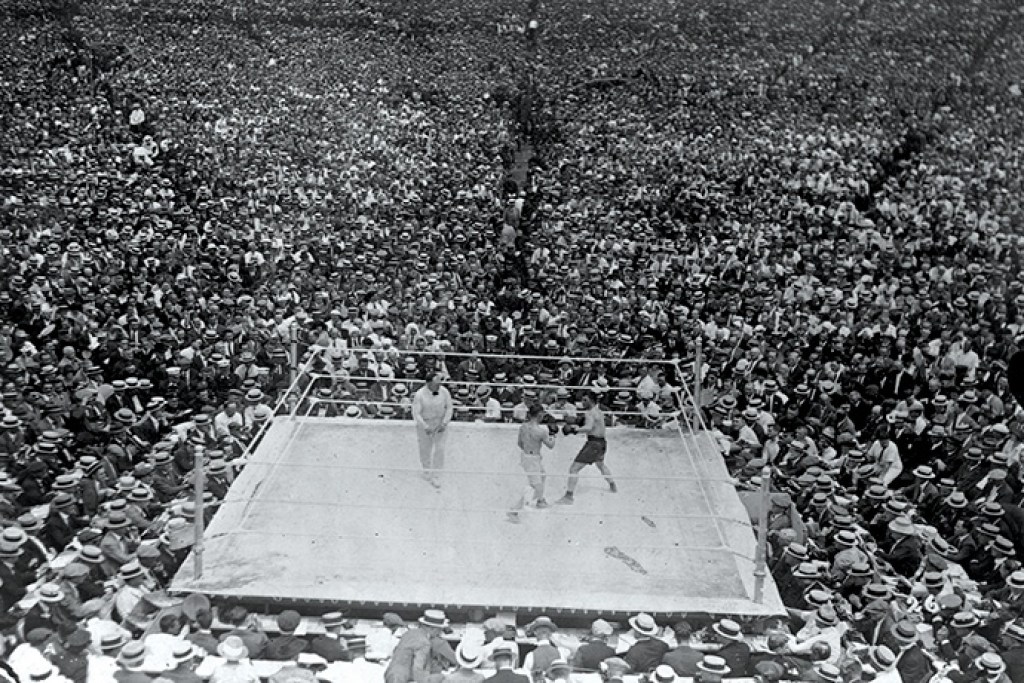 William Harrison Dempsey was born in June 1895 in Manassa, Colorado. Harry, as he was called, first competed as “Kid Blackie” and “Young Dempsey.” He became “Jack” Dempsey when he replaced his older brother, Bernie, in a 1914 fight against George Copelin. No matter what he was called, Dempsey was a great fighter and showman. He emulated the legendary bare-knuckles heavyweight champion John L. Sullivan by “waltzing into gyms” and proclaimed he could “lick any one of them.” He possessed “fists of thunder with a bazooka’s knockout capacity.” He lost fights to Jack Downey, Willie Meehan (twice), and Fireman Jim Flynn, but beat them all in rematches. His biggest moment was against heavyweight champion Jess Willard in 1919, who had defeated the first black champion, Jack Johnson. Dempsey, a “no mercy guy who understood that the law of the ring was that the other guy was out to get you, so you’d better be out to get him,” dominated the taller and more experienced Willard. The fight was “total destruction from start to finish,” and a new champion was crowned.