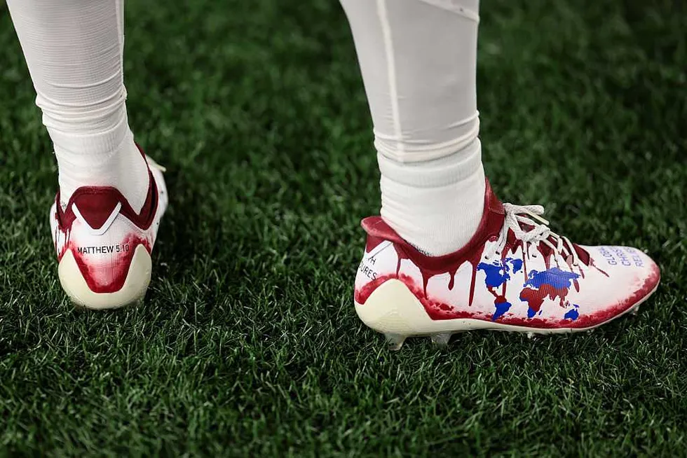 The shoe design featured raised crosses, praying hands, and blood drops to symbolize the blood of Christ and the blood of martyrs. Additionally the cleats featured a map highlighting regions around the world where Christians are persecuted, including Central America, Southeast Asia, and most of Africa.