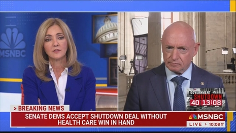 During an interview during Monday’s Chris Jansing Reports, Senator Mark Kelly (D-AZ) refused to defend or denounce Senate Minority Leader Chuck Schumer’s (D-NY) perceived failure on the government shutdown, even as Jansing repeatedly pressed him on growing resentment among Democrats. This came a day after several Senate Democrats joined Republicans to advance legislation that would have led to reopening the government.