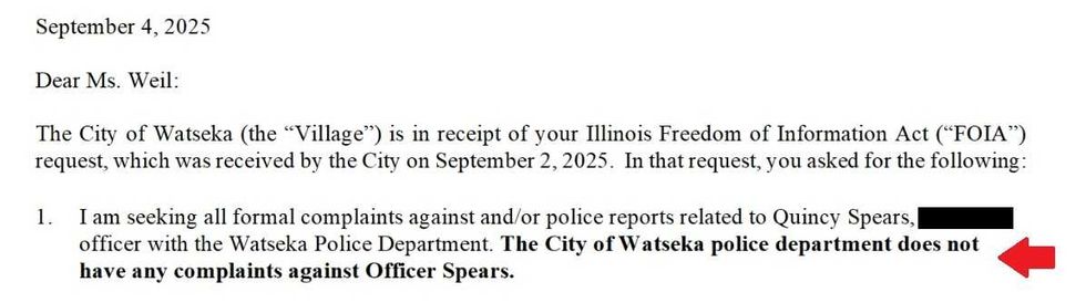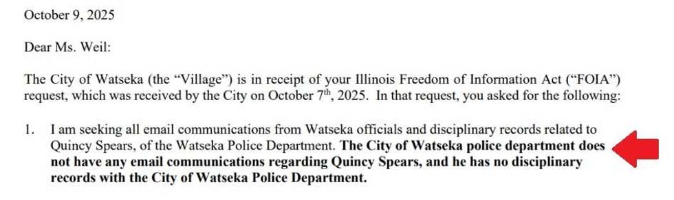 In response to public records requests, the City of Watseka told Blaze News on September 4 that its police department did “not have any complaints against Officer Spears.” The city reiterated on October 9 that the police department did “not have any email communications regarding Quincy Spears” and that he had “no disciplinary records” there.