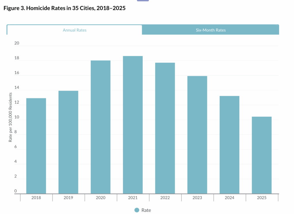 • The rate of reported homicides was 21% lower in 2025 than in 2024in the 35 study cities providing data for that crime, representing 922 fewer homicides. There were 9% fewer reported aggravated assaults, 22% fewer gun assaults, and 2% fewer domestic violence incidents last year than in 2024. Robbery fell by 23% while carjackings (a type of robbery) decreased by 43%.