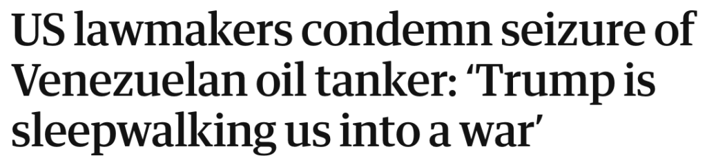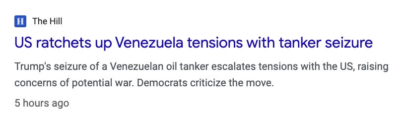 My argument stays the same: There’s a strategic effort underway that isn’t entirely clear, and we’ll see it become clear over time. The seizure of a stateless oil tanker carrying Maduro’s oil is aggressive, but it isn’t clearly reckless or an act of “sleepwalking.” We’ll see how it develops.