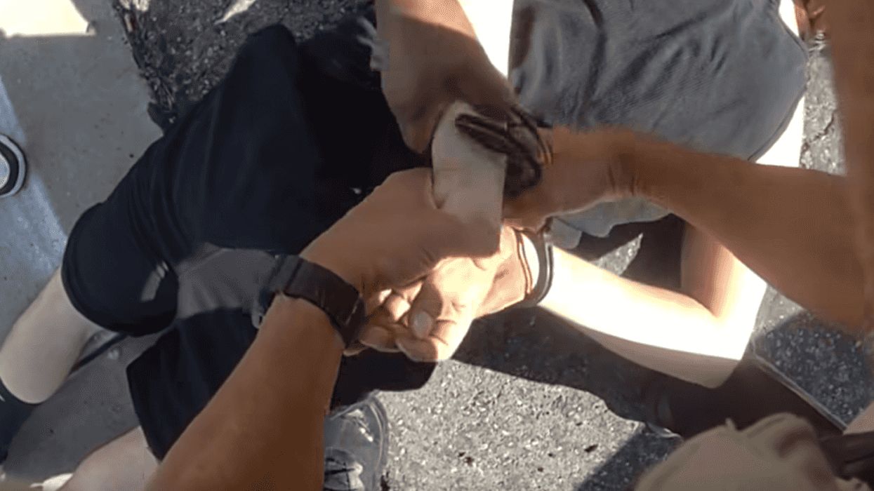 The motorist then sat on the suspect’s back, restraining him, until an arresting officer arrived on the scene and placed the suspect in handcuffs.