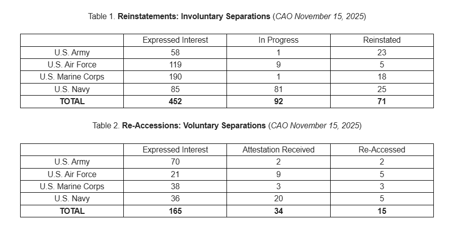 On Oct. 2, Hegseth personally reinstated Army Col. Kevin Bouren and appointed him to lead the new Covid Reinstatement Task Force. On Nov. 14, Bouren and Undersecretary of War Anthony Tata personally reinstated one of the other few soldiers to make it through so far, Army Capt. Mark Bashaw. Bashaw was retroactively promoted to captain from first lieutenant and reinstated with honors. On Nov. 19, Army Maj. Grant Smith joined the task force.
