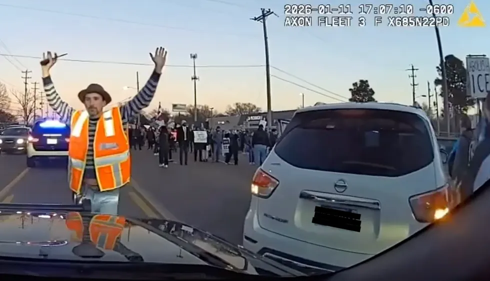 The clip — time-stamped Sunday just after 5 p.m. — shows a male dressed in an orange vest and carrying what appears to be a walkie-talkie exiting an SUV parked sideways on a street and approaching the oncoming state trooper’s vehicle as anti-ICE protesters mingle in the background.