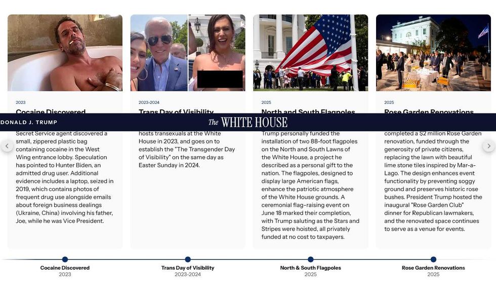 After highlighting how first lady Melania Trump oversaw the privately funded construction of the tasteful neoclassical tennis pavilion on the South Lawn, the White House timeline references how a bag of cocaine was found in the West Wing entrance lobby during Joe Biden’s time in office as well as the degenerate LGBT event Biden hosted at the White House in 2023 where a medical transvestite showed off his fake breasts on the South Lawn.