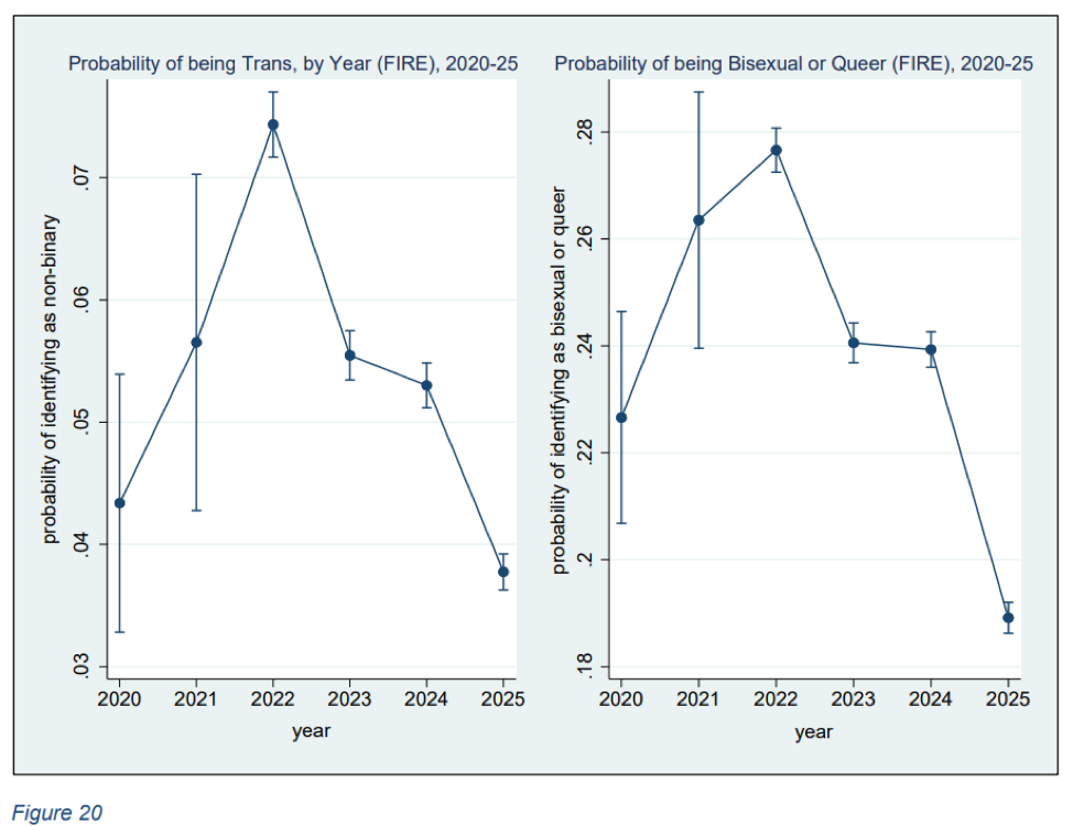 The same was shown to be true for alternative sexualities. While “traditional homosexual categories of gay and lesbian remained stable,” Kaufmann observed “a sharper rise and decline in the share identifying as bisexual and queer” as well as “questioning” and “pansexual” between 2020 and 2025. This decline was shown in “a return to heterosexuality.” The observation Bill Maher famously made that the sudden meteoric rise in these nouveau identities was suspect is now documented as true.