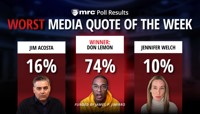 It’s time to find out who had the Worst Media Take of the Week. This interactive series is where you — our loyal NewsBusters visitors and MRC supporters — get to vote on which leftist journalist or celebrity had the worst media quote of the week.