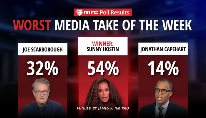 We’ve got a new interactive series called Worst Media Take of the Week, where you — our loyal NewsBusters visitors and MRC supporters — get to vote on which leftist journalist or celebrity had the worst media take of the week.