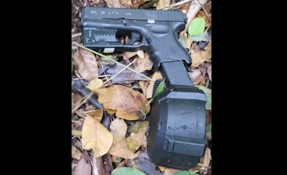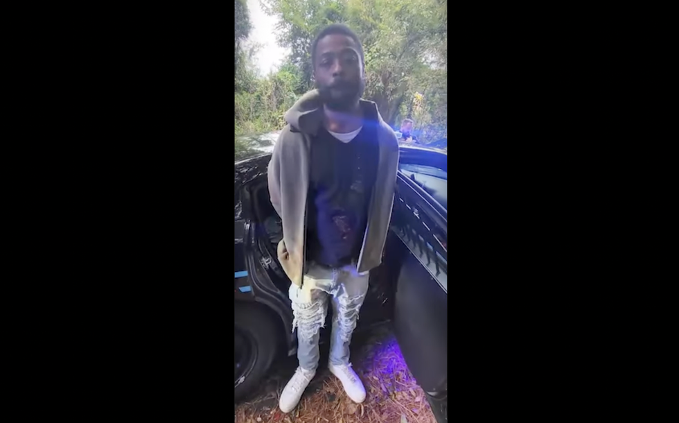 While running from his car, the suspect threw the gun into an adjacent wooded area, after which officers took him down to the street.